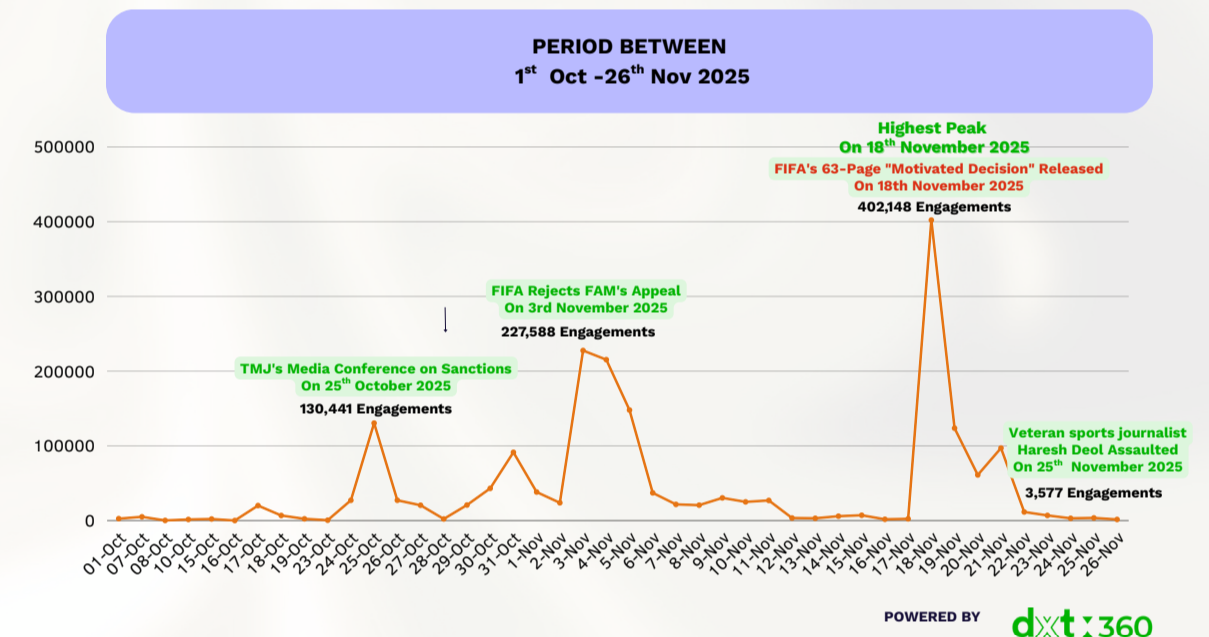 Everything flipped on 25 October with TMJ’s live press conference racking up 130,441 engagements, cracking the story wide open. Momentum spiked on 3 November (227,588 engagements) as FIFA rejected FAM’s appeal, slapping bans, fines, and CHF 8,000 costs. The ultimate explosion hit on 18 November (402,148 engagements) with FIFA’s 63-page bombshell dropping criminal referrals to five countries.